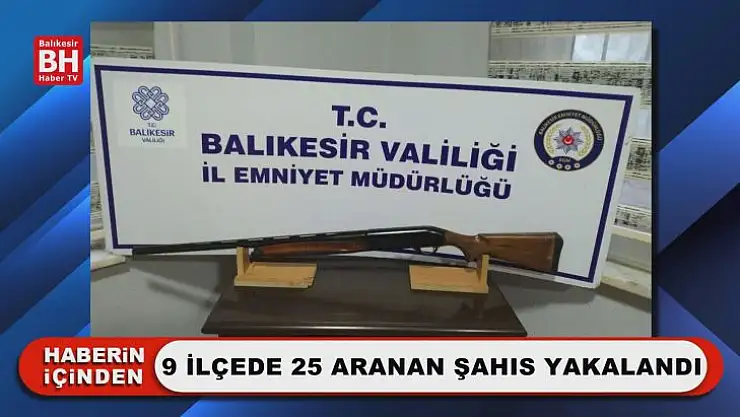 Balıkesir İl Emniyet Müdürlüğünce İlde genel güvenliği ve asayişi sağlamak amacıyla Asayiş Şube Müdürlüğü, Karesi, Bandırma, Burhaniye, Kepsut, Edremit, Gönen, Havran, Sındırgı ve Susurluk ilçelerinde yapılan çalışmalarda 25 aranan şahıs yakalandı, 13 şahıs tutuklandı.