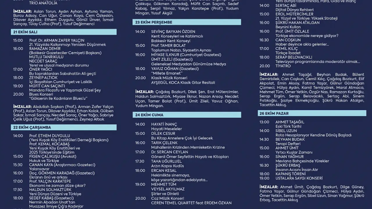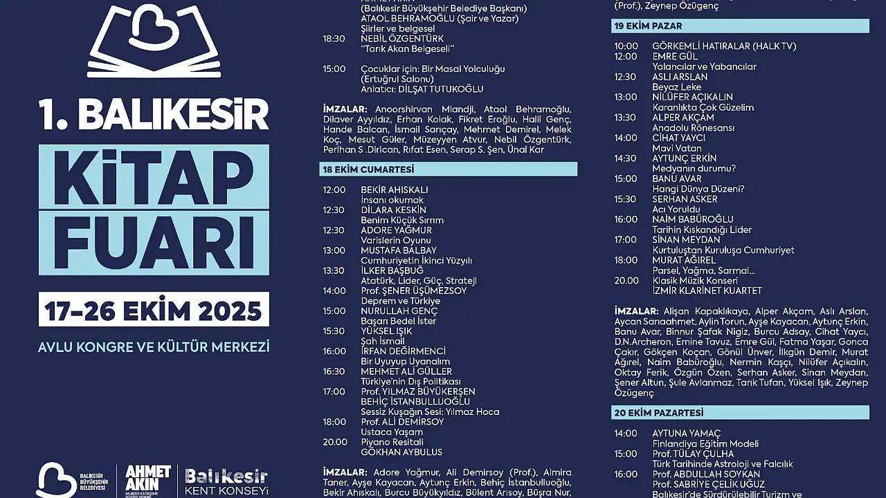 Avlu Kongre ve Kültür Merkezi’nde 17-26 Ekim tarihleri arasında her gün 10.00 ila 21.00 saatleri arasında ziyarete açılacak olan fuarın açılış töreni 17 Ekim 2025 Cuma günü saat 18.00’de yapılacak 10 gün sürecek fuarda Ayşe Kulin, Ataol Behramoğlu ve Prof. Dr. Yılmaz Büyükerşen onur konuğu olacak.Aralarında Ahmet Ümit, Ercan Kesal, Sinan Meydan, Nebil Özgentürk, Erol Mütercimler, Nilüfer Açıkalın, Nurullah Genç, Öner Yağcı, Ramazan Kurtoğlu, Haldun Solmaztürk, İlker Başbuğ, Cihat Yaycı, Naim Babüroğlı, Yalçın Karatepe, Zeynep Altıok, Aytunç Erkin, Banu Avar, Can Coşkun, Can Uğur, Cem Özkeskin, Gökmen Karadağ, İrfan Değirmenci, Mehmet Ali Güller, Mustafa Balbay, Murat Ağırel, Necdet Saraç, Sedef Kabaş, Serap Belovacıklı, Serpil Yılmaz, Sinem Fıstıkoğlu, Yavuz Oğhan gibi kamuoyunun yakından tanıdığı birçok yazar ve gazeteci 1. Balıkesir Kitap Fuarı’nda hem kitaplarını imzalayacak hem de farklı konularda söyleşi yapacaklar. Fuarın programı Balıkesir Büyükşehir sosyal medya hesaplarından ve LED ekranlardan takip edilebilecek.